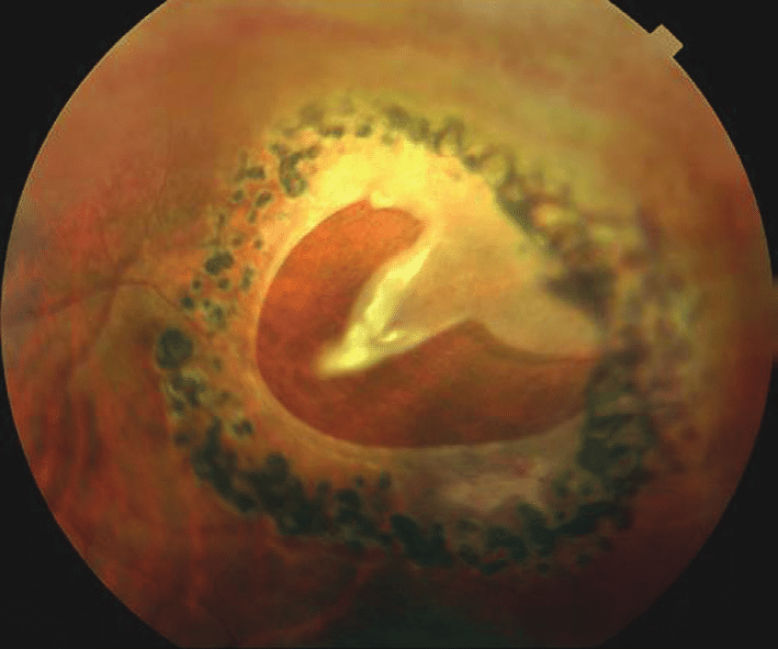 視網膜裂孔周圍施打光凝固雷射後形成穩固的疤痕組織。(圖片來源:The Retinal Atlas)