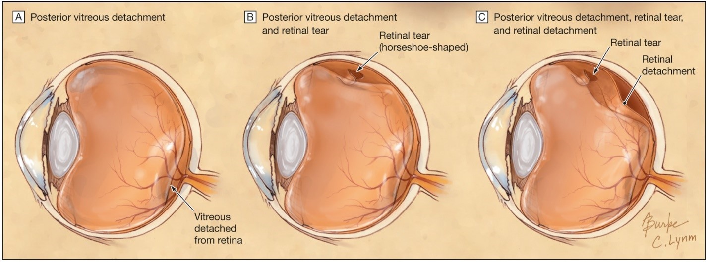 玻璃體退化,導致視網膜裂孔,進而產生視網膜剝離。(圖片來源https://reurl.cc/dL25x6)