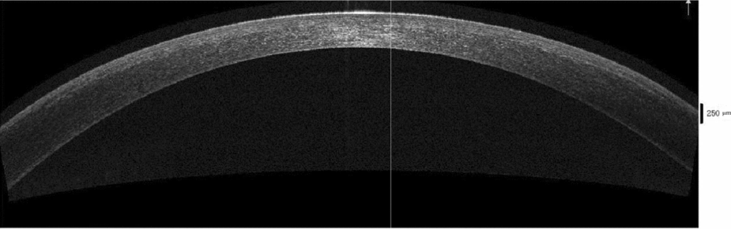 在門診曾經聽到病人質疑:「別家說做 SMILE 手術,中間永遠都有空隙?」這份論述真是讓我滿頭黑人問號,啼笑皆非。SMILE 手術後輕柔撫平上帽蓋與基質層間隙,角膜膠原蛋白纖維便會緊密貼合。醫學講究科學根據,手術後隔天立刻以超高解析度掃頻海德堡 OCT 進行光學斷層掃描,可以看到光學介面各個角度均沒有任何空腔或裂隙,可以非常放心。